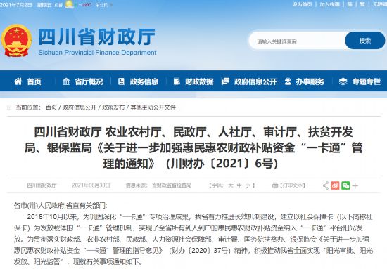 7月2日,封面新聞記者從四川省財政廳處獲悉,四川省財政廳聯合四川省農業農村廳、民政廳、人社廳、審計廳、扶貧開發局、銀保監局一同發布了《關于進一步加強惠民惠農財政補貼資金“一卡通”管理的通知》。