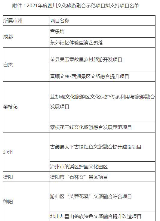 該公示稱,根據2021年四川省文化旅游融合示范項目工作安排,在市(州)文化和旅游、財政部門推薦、初審基礎上,2021年3月至7月初,四川省文化和旅游廳會同四川省財政廳對2021年度全省申報項目進行了資格預審、陳述答疑、專家評審和部門審核,根據綜合評定情況,擬對34個申報項目予以支持。