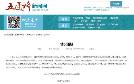 7月31日晚,關于四川樂山市五通橋區發生一起新冠肺炎病例的相關消息,五通橋區新冠肺炎疫情應急指揮部發布情況通報: