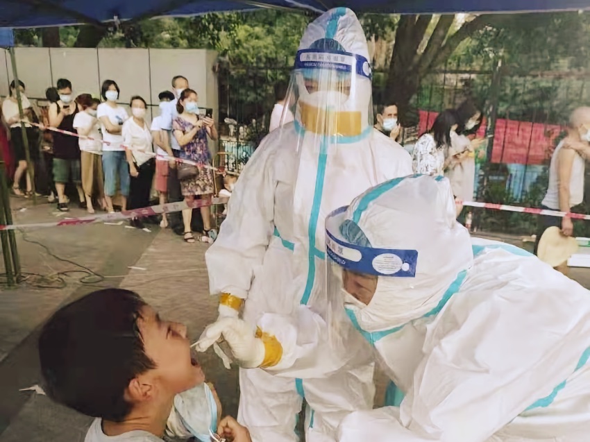 醫務人員穿著厚厚的防護服,頂著烈日在戶外臨時采樣點為群眾提供核酸采樣。盡管醫院加派醫務人員,大家交替上陣,但每次脫下防護服,汗水還是浸濕了所有衣衫,頭發都能擰出水。