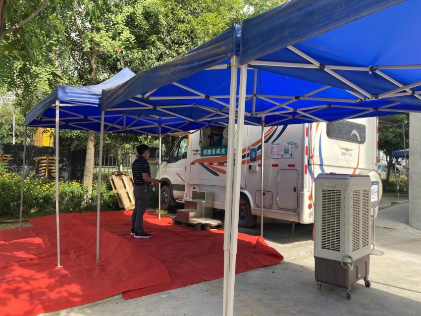 7月30日,楊冀將房車開到成都龍泉驛區西河鎮公立衛生院,劉紅軍院長立即組織工作人員到采樣點,迅速將車輛改造成了“移動采樣車”,并在采樣車外搭建帳篷和冷風機,解決群眾防暑等問題。