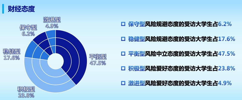 從財經態度來看,受訪大學生財經態度屬于中等水平,47.5%的大學生持有平衡型風險態度,僅有6.2%和4.9%的大學生分別持有保守型和激進型風險態度。