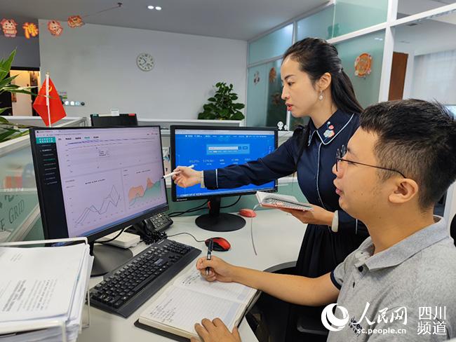 9月16日,國網天府新區供電公司工作人員胡園園、郗寧正在使用“天府能源智慧大腦”平臺開展碳達峰碳中和相關監測分析。楊月紅攝