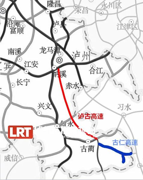 圖中紅色線為瀘古高速、藍色線為古仁高速