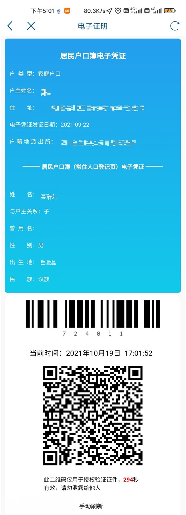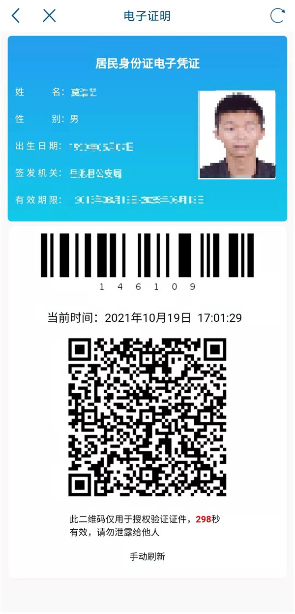不用擔心信息外泄。電子憑證與手機硬件形成綁定,別人無法偽造、無法使用截圖(截圖無300秒時間倒計時),有效保障申領人的信息安全。