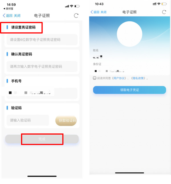 (6)以居民身份證為例,選擇“居民身份證”后,進入身份驗證頁面,按提示輸入即可;點擊“完成”進入人臉識別頁面(注意:“亮證密碼”是6位數字);