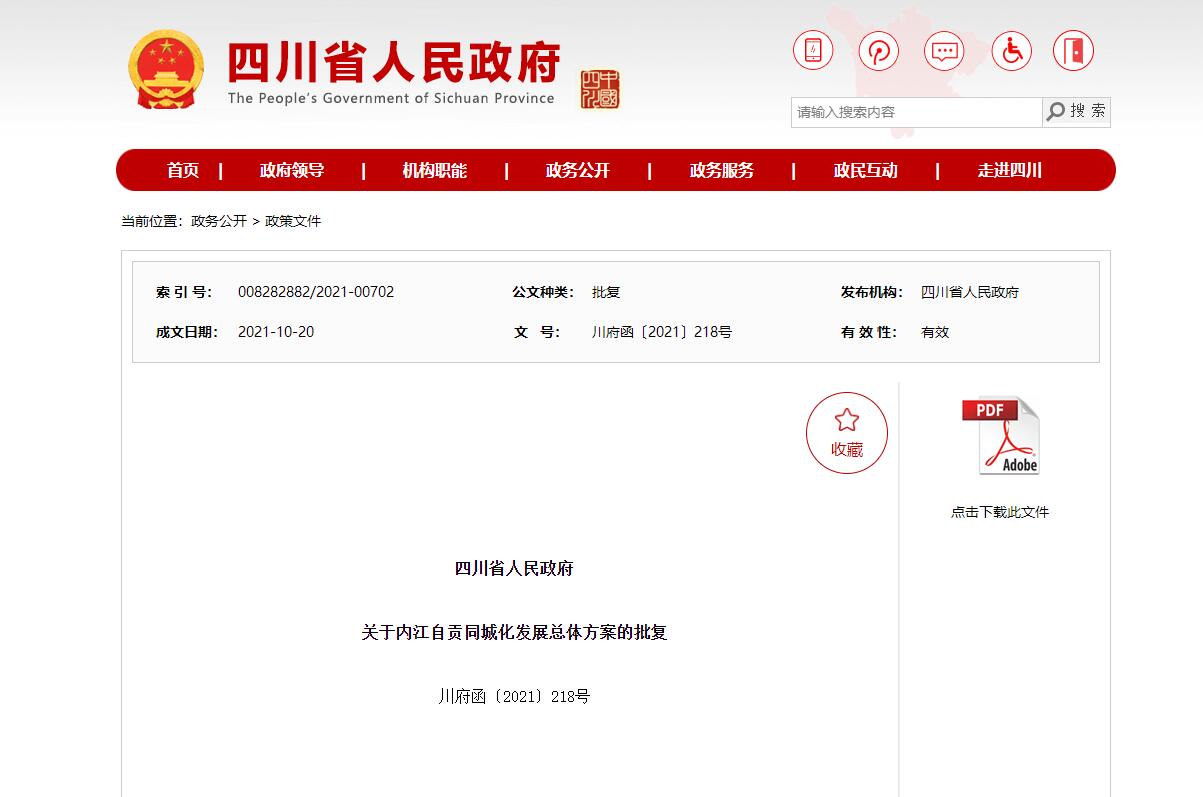 省發展改革委《關于報送〈內江自貢同城化發展總體方案(送審稿)〉的請示》(川發改〔2021〕285號)收悉,F批復如下: