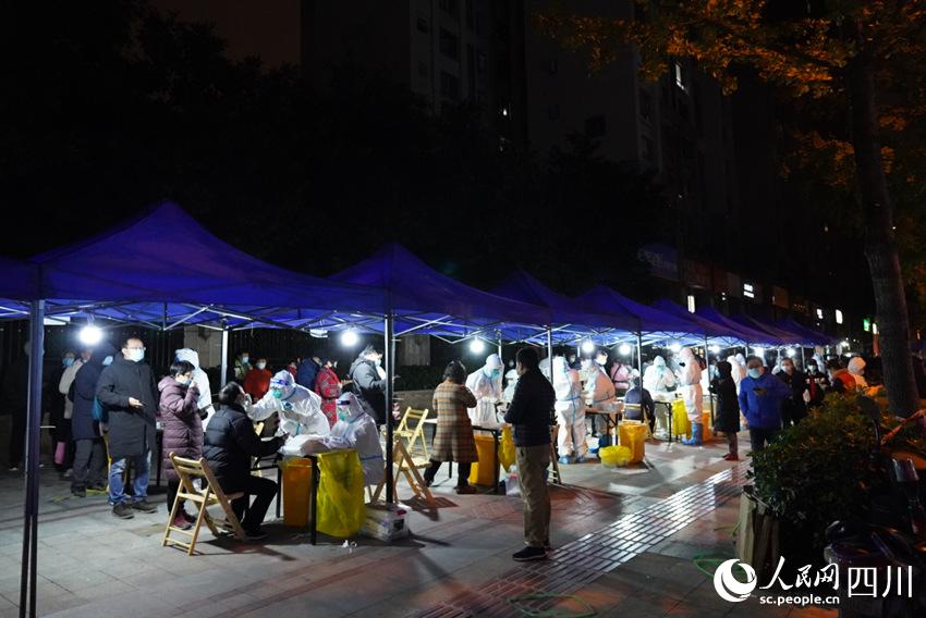 11月8日,成都市成華區、錦江區先后發布通知,要在部分區域進行全員免費核酸檢測。當晚,居民排起長隊接受核酸檢測,現場秩序井然,各項工作有條不紊。