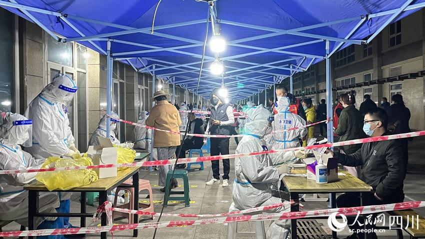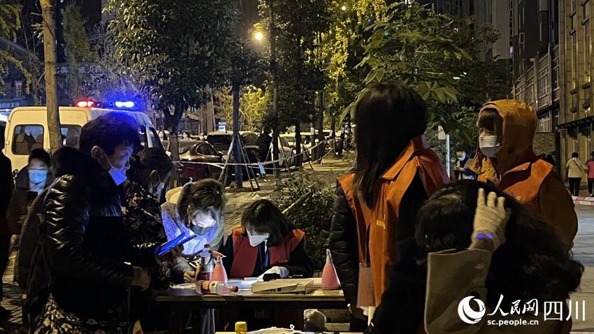 成都市錦江區成龍路街道華新社區核酸檢測點,志愿者一直在忙碌。人民網 趙祖樂攝