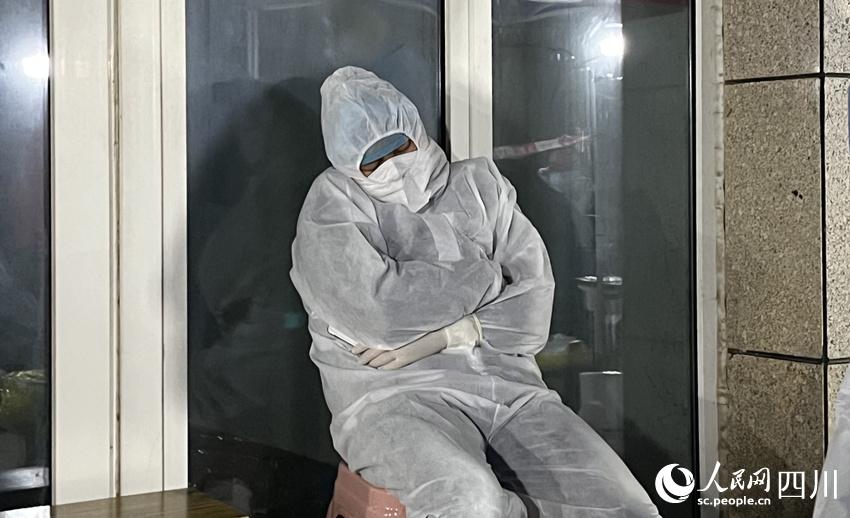 成都市錦江區成龍路街道華新社區核酸檢測點,一位醫護人員工作間隙小憩。人民網 趙祖樂攝
