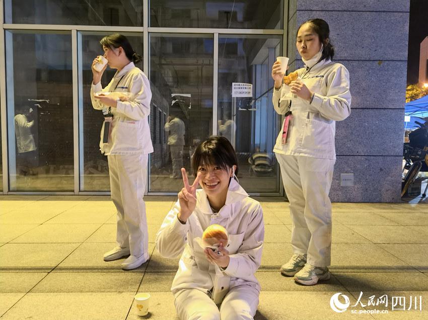 11月9日凌晨1點,成都成華區十一科技廣場的醫護人員在奮戰數小時后席地而坐,仍舊露出溫暖的笑容。王小雪攝