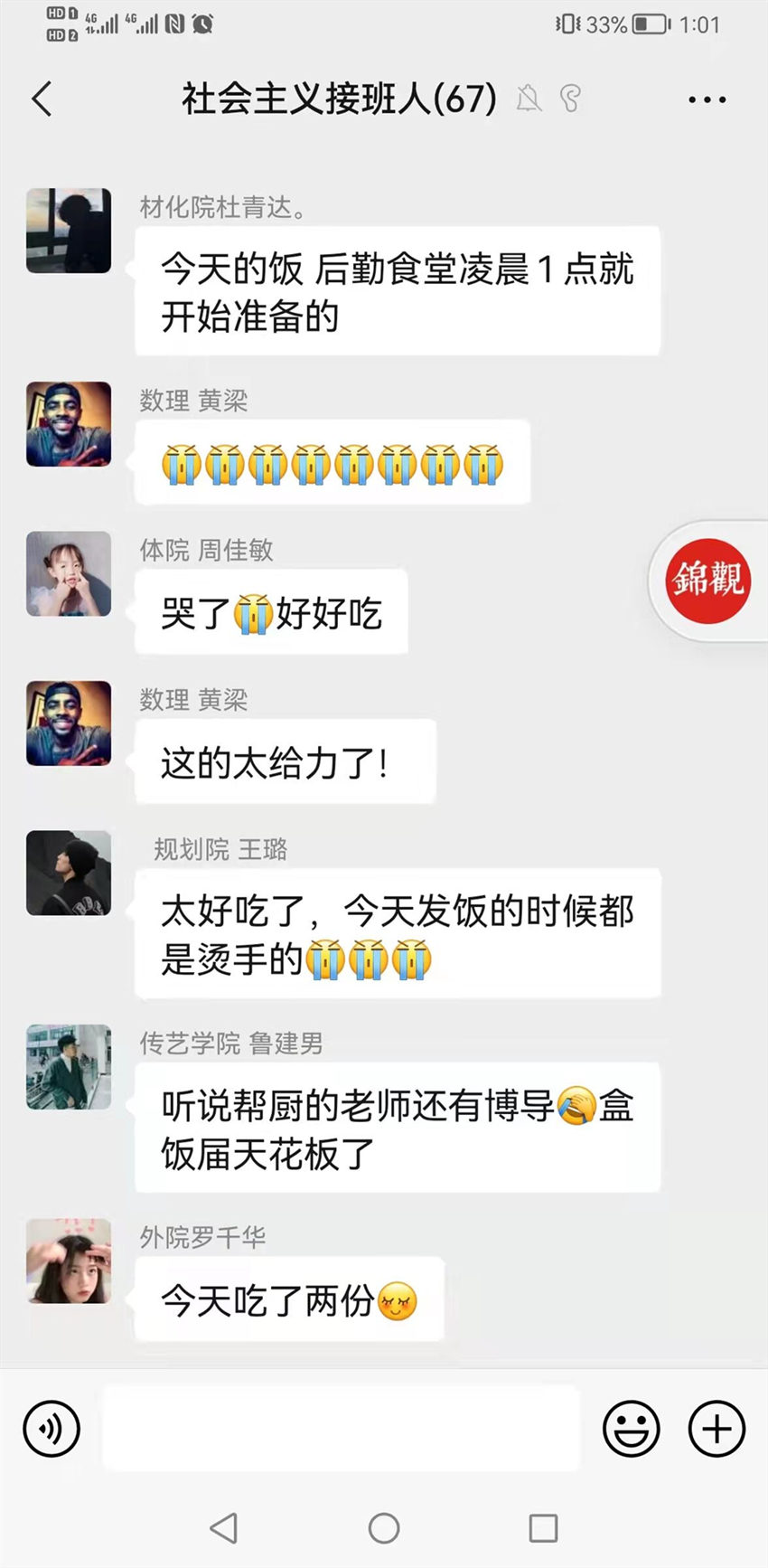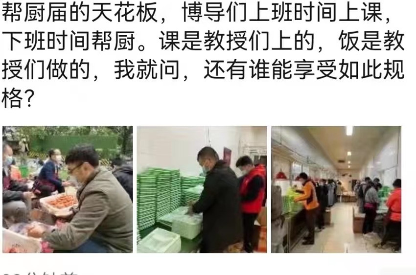 當“幫廚天團”的照片在網上引發關注后,學生們也在朋友圈和微博發表了各自的看法。他們還在學院群里評論:“太好吃了!吃了充滿學術的力量!”“據說后廚1點就開始準備了,感動!”一位學生在微博上表示,“幫廚界的天花板!老師們上班時間上課,下班時間幫廚,同學們的課是老師上的,飯是老師做的,疫情之下的理工處處充滿著愛!边有學生在朋友圈猜想“今天吃的蘿卜可能就是劉教授切的”。李春輝的學生還悄悄給教授發了條短信:“以父母之心,行教育之事!
