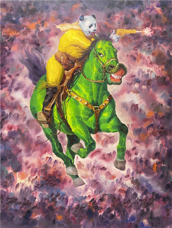 人民網成都11月12日電 “全民保住綠碼,熊貓騎在綠馬身上......”近日,作為成都本土藝術家、成都錦城學院藝術學院邱光平教授拿起他畫筆,將馬全部畫成了綠色,“熊貓騎士綠馬系列”呼之欲出。