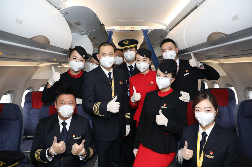 “中國民航英雄機長”劉傳健執飛武漢接援鄂醫療隊回蓉。川航集團供圖
