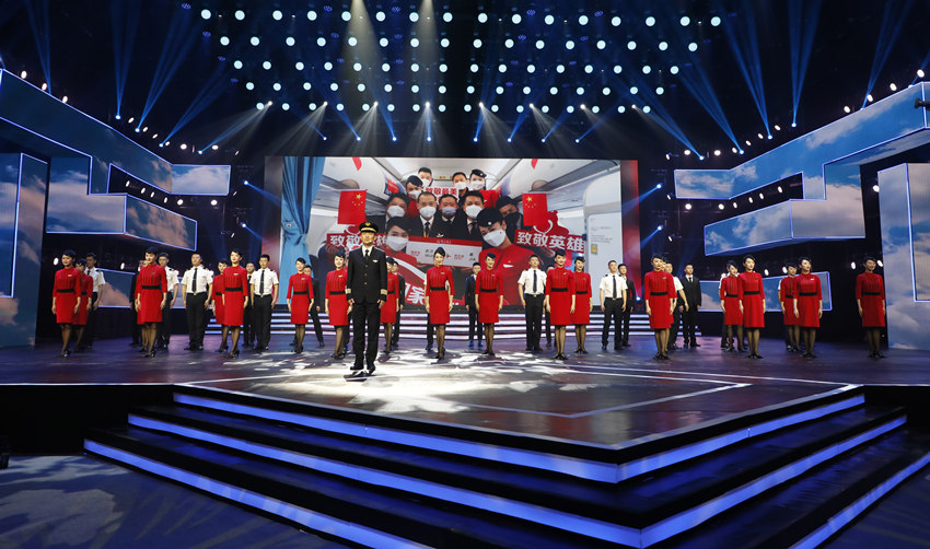 川航大型舞臺劇——《一起戰“疫”的我們》參加四川省國資國企戰“疫”主題活動。川航集團供圖