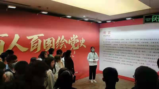 據介紹,美術與設計學院、馬克思主義學院先后有170余名師生投入主題創作,經過不懈努力,“百人百圖繪黨史”創作展于今年6月28日開幕。展覽吸引了眾多觀眾參觀,該學院為此專門安排30余名同學作為專業講解員,常駐展覽現場,為觀眾進行作品講解!鞍偃税賵D繪黨史”創作展一時成為學校黨史學習教育的重要陣地,已接待觀眾達6300余人次。