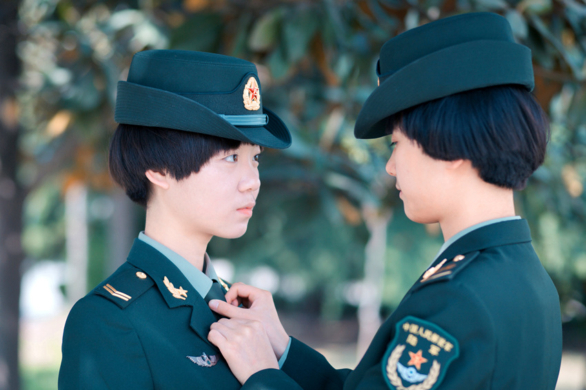 萬潔(左)當兵時的樣子。成都市成華區退役軍人事務局供圖
