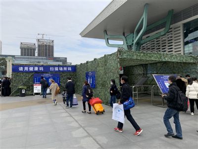 成都東站,乘客戴口罩、用健康碼掃場所碼進站