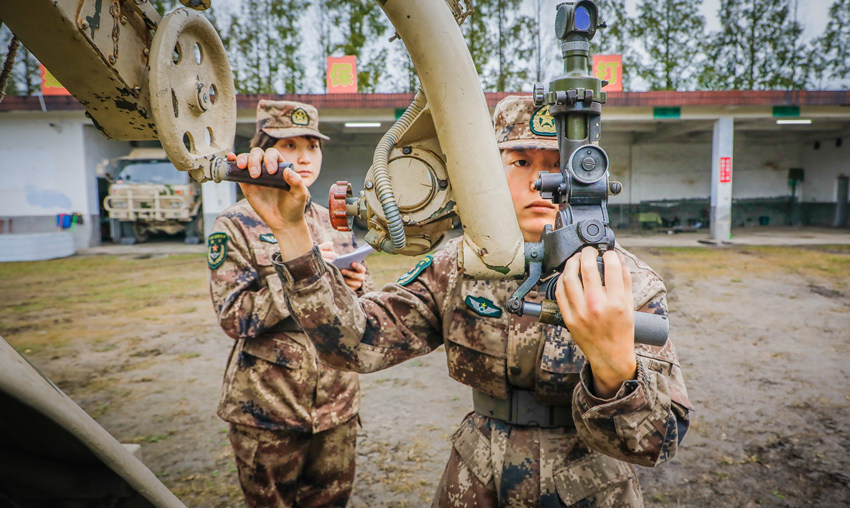 王茜茜(右一)在進行炮兵專業訓練。陸軍第77集團軍某炮兵旅供圖