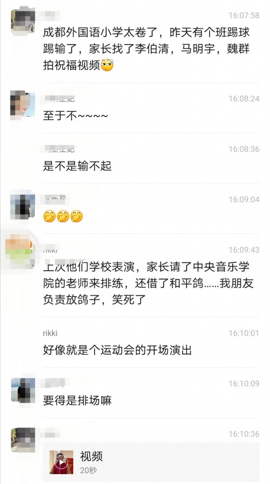 12月15日,網上流傳一貼子,稱“成都外國語小學太卷了,昨天有個班踢球踢輸了,家長找了李伯清,馬明宇,魏群拍祝福視頻……”引發“學校太卷,家長曬資源”等議論。