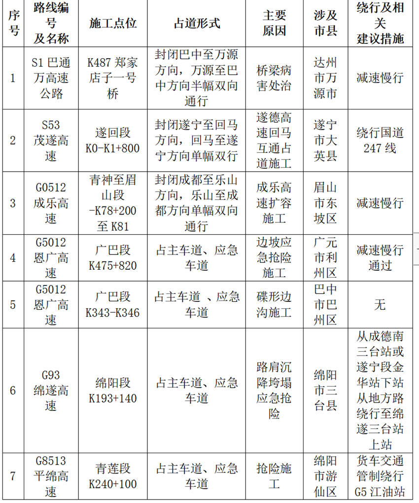 根據國務院辦公廳2022年節假日安排,元旦假期間,高速公路不執行小型客車免費通行的政策。2022年1月1日至3日,四川省高速公路禁止危險化學品運輸車輛通行,暫停對運輸超限超載不可解體物品車輛允許通行高速公路的意見反饋。出行高峰1月1日上午8時至12時、返程高峰1月3日12時至20時,禁止三軸(含三軸)以上(不含鮮活農產品運輸車)重型貨車進入高速公路。