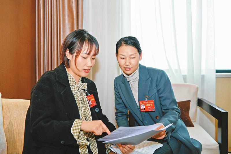 1月17日,四川省人大代表柳莉平(右)、官小慶就共同關注的話題展開討論。 四川日報全媒體記者 楊樹 攝