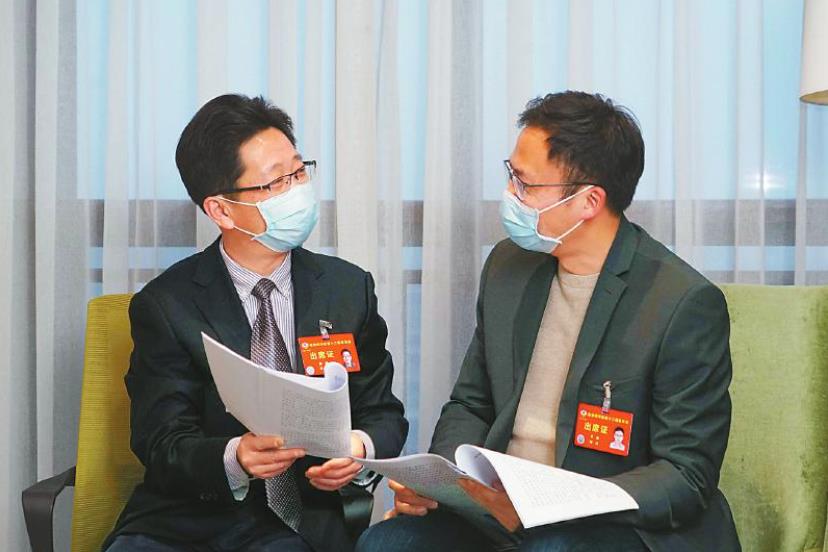 會議間隙,陳彬委員(左)與李涵委員就“雙碳”人才培養的問題展開討論。