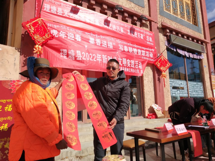 人民網成都1月21日電 虎年春節和藏歷新年將至,日前,四川省甘孜藏族自治州理塘縣勒通古鎮·千戶藏寨門口人頭攢動,十分熱鬧。當地相關部門正在此開展“虎年迎福、墨香送!睂懘郝撡洿郝摶菝穹⻊,活動共送出220余副藏漢語對聯和斗方福字。