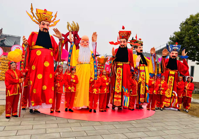 最受當地群眾喜愛的民俗特色節目當屬《五福獻瑞》《老鼠嫁女》《采蓮船》等方陣表演。壽星、天官、財神等福瑞形象,手持象征美好寓意的“福、祿、壽、喜、財”,伴隨著一路上“老鼠嫁女”迎親隊伍悅耳動聽的嗩吶聲,再加上鮮艷的彩船在隊伍前面不斷地靈活穿插,喜氣洋洋的演出給圍觀群眾帶來了陣陣歡笑。
