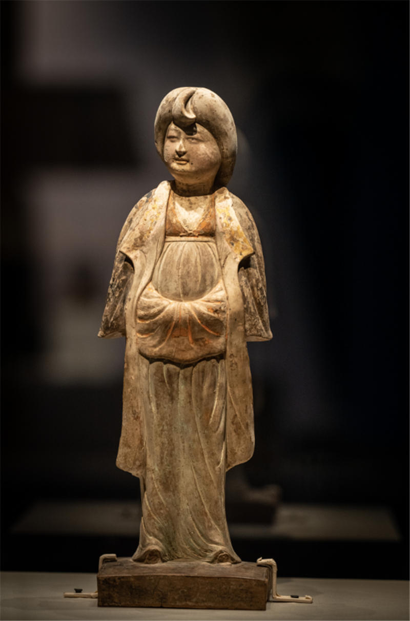 慶城縣博物館的彩繪灰陶女俑。來自開元盛世的女俑頭梳發髻,雙鬢烏發遮耳,身著曳地長裙,足蹬翹頭履,罩黑色大折領外披,雙手攏于腰間,形態端莊大方,雍容華貴。張羽騰供圖