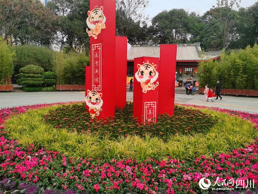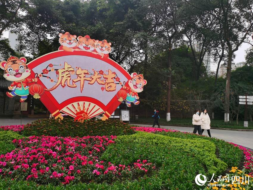 園內的幾處空地上,布置了幾個花壇。上邊除了吉祥的紅黃色彩,還有可愛的動漫形象老虎圖案!盎⒛昙椤薄敖鸹⒂骸薄靶履昕鞓愤^年好”……各種好彩頭的詞語,標示出歡度春節的主題,看了讓人精神為之一振。