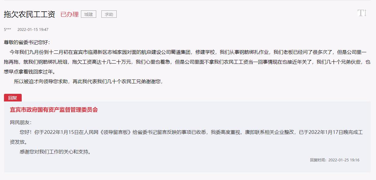 收到該留言后,宜賓市政府國有資產監督管理委員會高度重視,賡即聯系相關企業整改,企業于1月17日晚完成了工資發放。