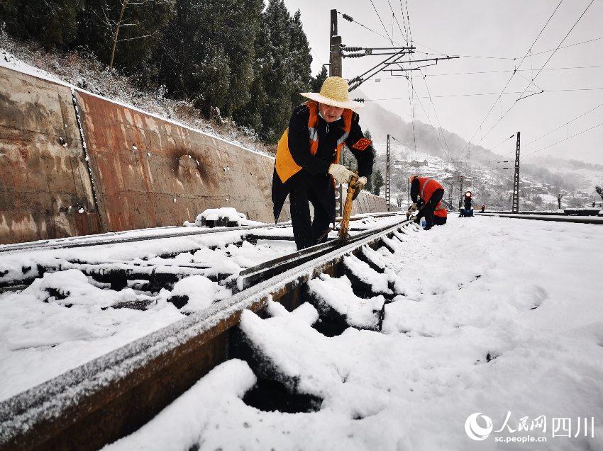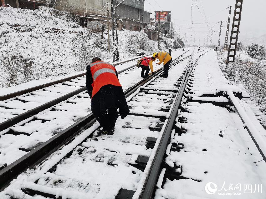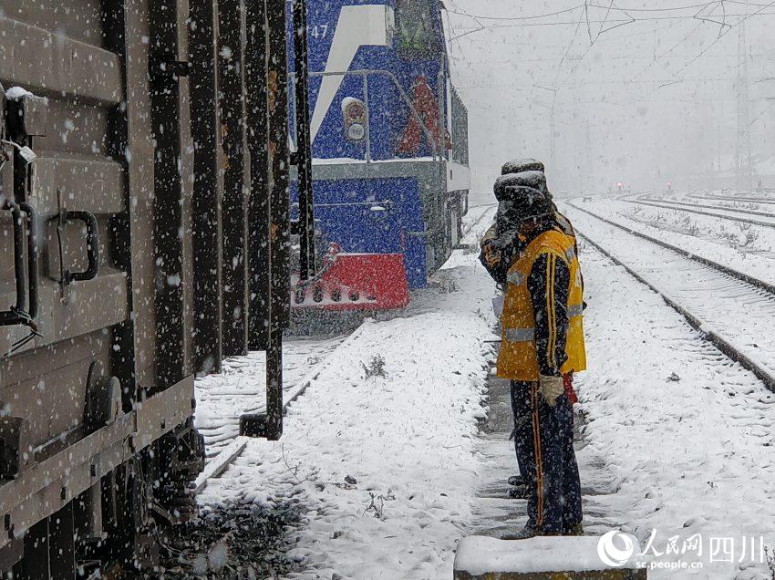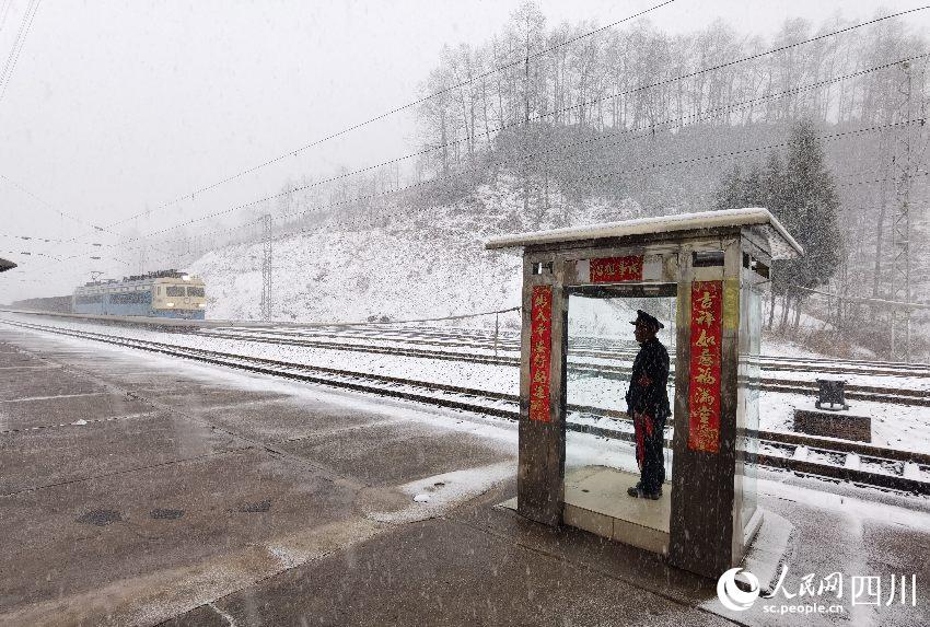 人民網成都1月28日電 臨近春節,新一輪的強降溫來襲,今日,中國鐵路成都局集團有限公司峨眉車務段管內的鐵西、下普雄、拉白等車站迎來降雪,室外氣溫一度低至零下8度。