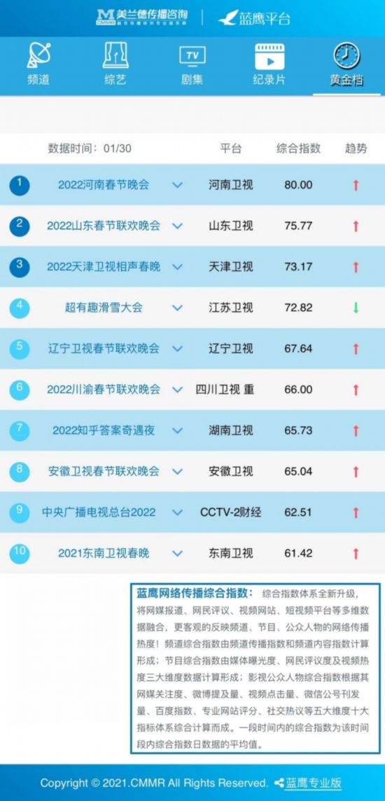 美蘭德融合數據顯示,30日單天《2022川渝春節聯歡晚會》網媒曝光度54.30,網民評議度79.66,美譽度高達99.60;視頻熱度64.52,視頻網站熱度63.78,短視頻平臺熱度71.15,藍鷹網絡傳播綜合指數排名全國第六。