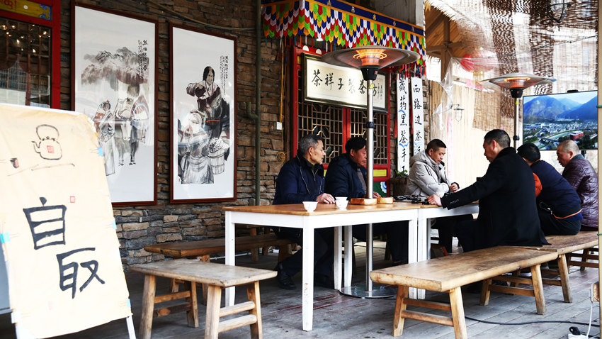 在位于映秀鎮東莞大道的“茶祥子”制茶坊里,老板蔣維明正在和客人聊天?!安柘樽印敝撇璺坏牟杷敲赓M提供的,每天都有許多游客前來飲茶、歇息。