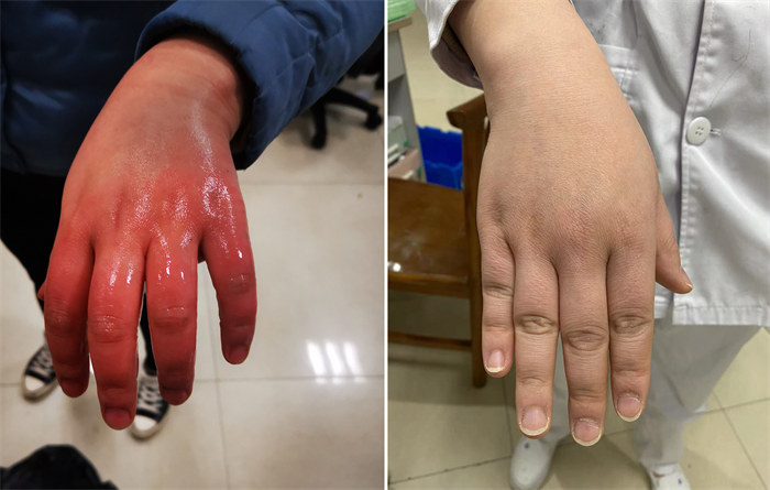 朱姝姝此前通紅、腫脹的雙手。受訪者供圖