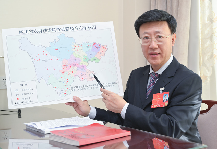 羅佳明:關于“鐵索橋改公路橋”。受地形地質條件和發展水平等因素制約,四川部分山區農村還存在通過人行鐵索橋解決群眾村內出行和生產生活物資運輸的情況。鐵索橋雖在一定程度上方便了山區群眾出行,但由于建設標準低、運營時間久遠、日常管護不到位等原因,在保障群眾安全通行、方便農村物資運輸、適應農民群眾出行方式改變等方面逐漸凸顯出一些問題,難以滿足當地群眾對美好生活的向往,也與鄉村振興戰略實施對交通的要求有一定差距。