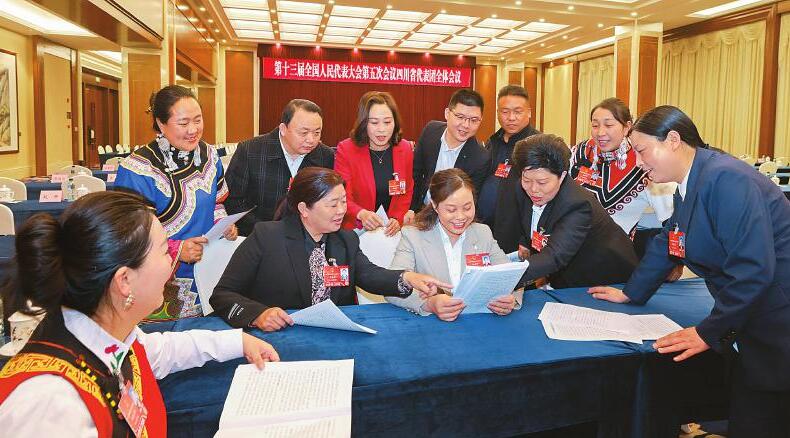 四川代表團中有11位代表是村黨支部書記,促進鄉村全面振興成為他們共同關注的話題。小組會后,他們又聚在一起交流參會心得。(四川日報全媒體記者 歐陽杰 攝)