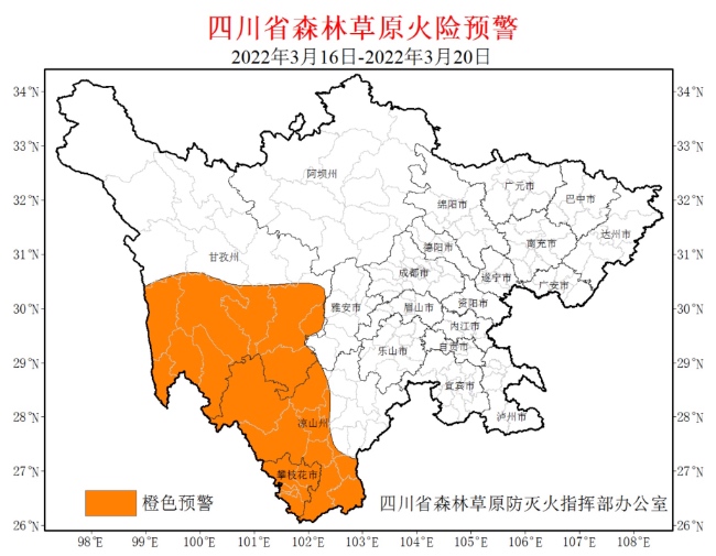 四川省森防指辦公室、省林草局、省氣象局經過會商,綜合研判氣象條件、林區物候、野外火源及火災發生情況,預計3月16日至20日,上述地區森林草原火險等級將維持在高度危險級別,防火形勢十分嚴峻,特發布高森林草原火險橙色預警。上述地區要高度重視,密切關注天氣和森林草原火險變化趨勢,督促指導有關地區嚴格按照《四川省森林草原防滅火指揮部關于分區分級常態化抓好森林草原火險精準防控工作的通知》(川森防指〔2021〕31號)要求落實響應措施,嚴防發生森林草原火災。