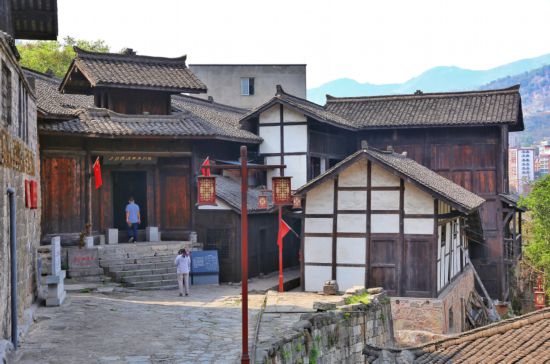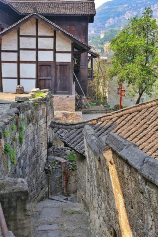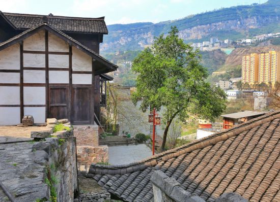 錯落有致,鱗次櫛比的青瓦板壁老屋依山勢而建,清幽雅致的吊腳樓、清晰可見的鹽拐石印……構成了川南獨具風格的山地古鎮風貌。