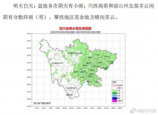19日晚上到20日白天:盆地各市陰天有小雨,其中達州、廣安、南充3市和綿陽、德陽、成都3市西部有中雨,達州、廣安2市有大雨到暴雨;川西高原和涼山州北部多云間陰有分散陣雨(雪),攀西地區其余地方晴間多云。