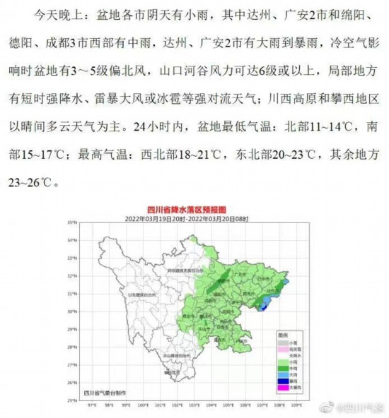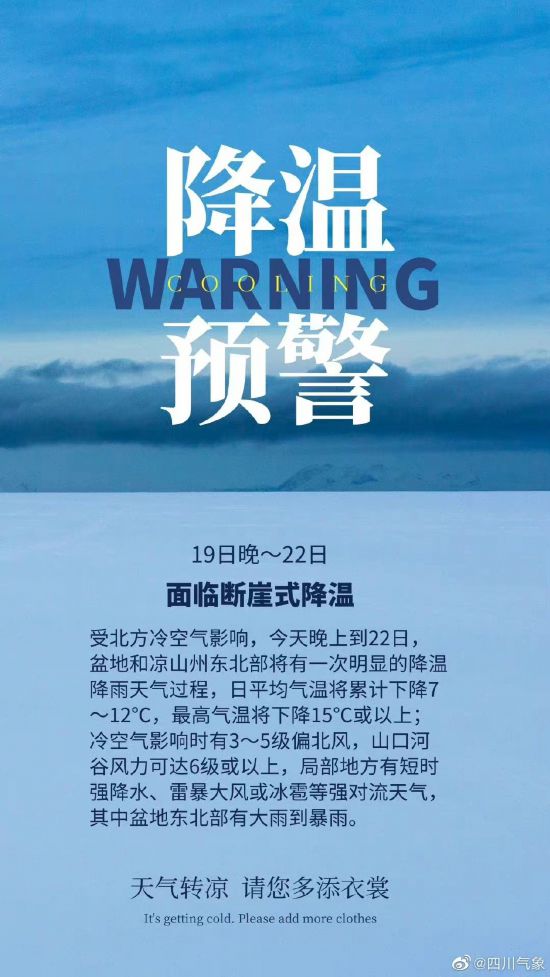 據四川氣象消息,受北方冷空氣影響,3月19日晚上到22日,盆地和涼山州東北部將有一次明顯的降溫降雨天氣過程,日平均氣溫將累計下降7~12℃,最高氣溫將下降15℃或以上;冷空氣影響時有3~5級偏北風,山口河谷風力可達6級或以上,局部地方有短時強降水、雷暴大風或冰雹等強對流天氣,其中盆地東北部有大雨到暴雨。
