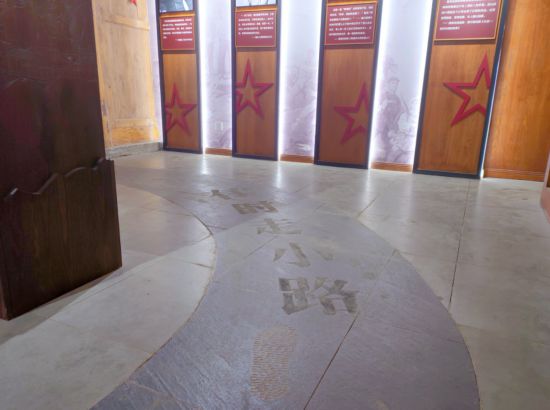 “有時向東,有時向西,有時走大路,有時走小路,有時走老路,有時走新路!痹谘b飾一新的白沙會議展廳的地面上,設計方刻意用地板的形狀,描述了紅軍長征時所經歷的征途曲折。