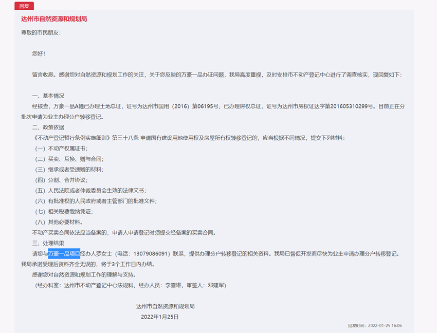 “我局已督促開發商盡快為業主申請辦理分戶轉移登記。我局承諾受理后資料齊全無誤的,將于3個工作日內辦結!笔盏搅粞院,依據相關政策,達州市自然資源和規劃局及時給予回復和督辦。