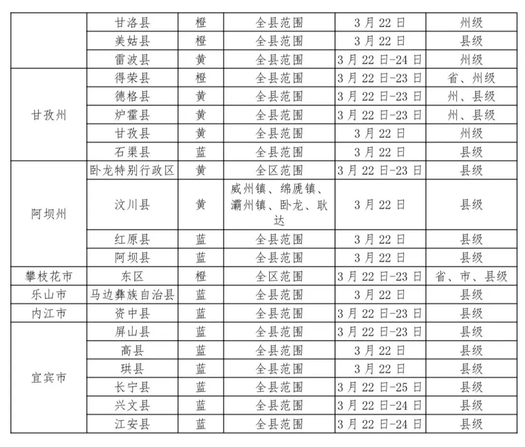人民網成都3月22日電 (朱虹)據四川省森林草原防滅火指揮部辦公室消息,截至3月21日21時,四川全省所有縣(市、區)火險預警信號:紅色11個,橙色18 個,黃色13個,藍色13個。