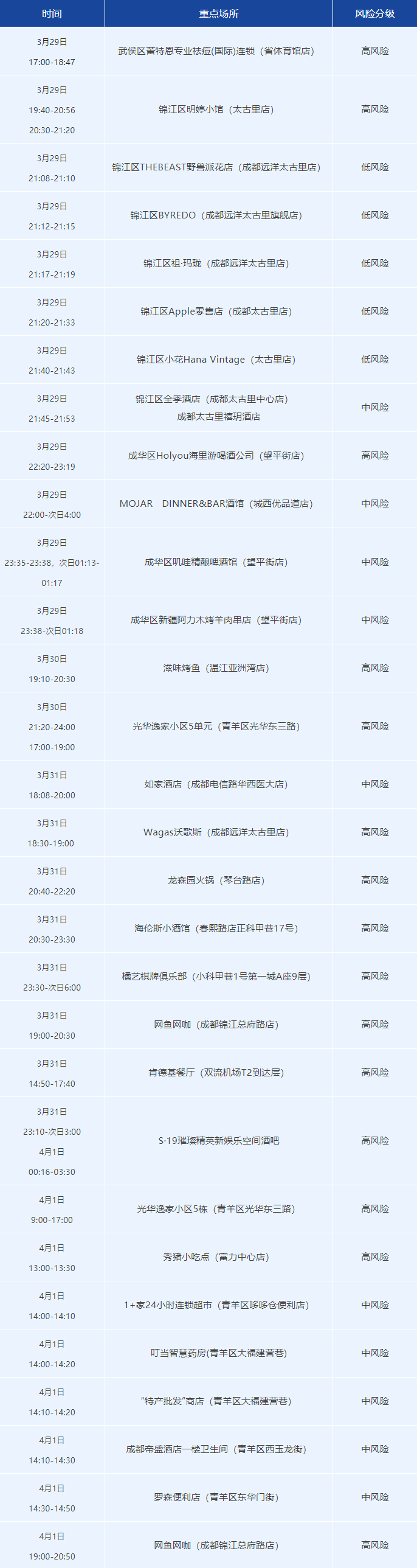 根據病例在蓉軌跡確定的風險點位現公布如下,請與下列軌跡有重疊的市民立即向社區和單位(或居住的酒店)報備,并盡快接受核酸檢測。