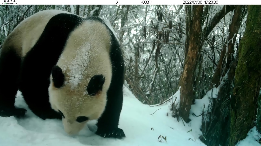 大熊貓國家公園滎經縣管護總站的紅外相機在泥巴山廊道拍攝到的大熊貓。圖片來自視頻截圖