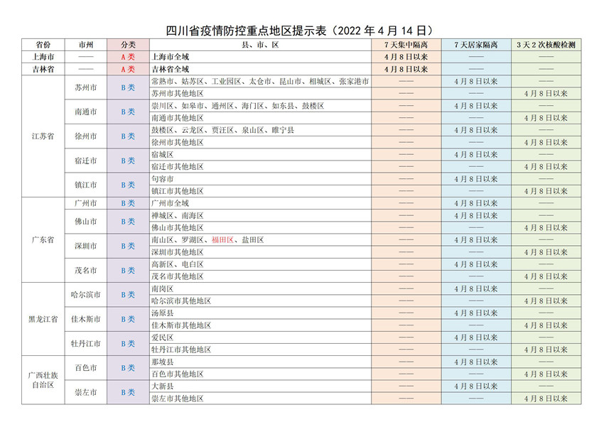 人民網成都4月15日電 (王波)據四川疾控消息,自4月15日起,四川省根據風險大小,將國內有本土疫情發生的地市(包括地級市、省會城市、直轄市劃分為A類地區(疫情輸入四川省風險高的地市)、B類地區(除A類地區外,有本土疫情發生的省外其他地市),實行分類管控。
