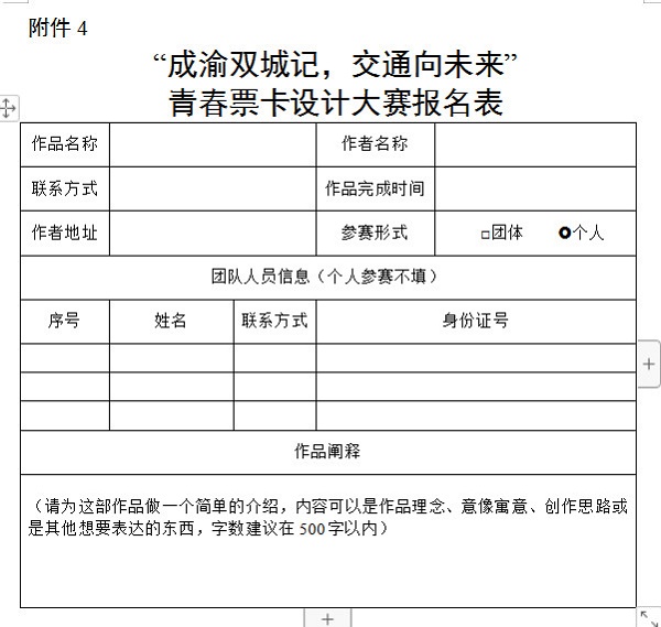 1.《成渝青春票卡設計大賽參賽報名表》(附件4);