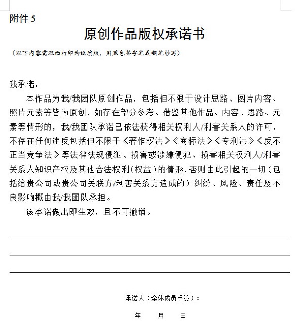 2.《原創作品版權承諾書(簽字掃描件)》(附件5);